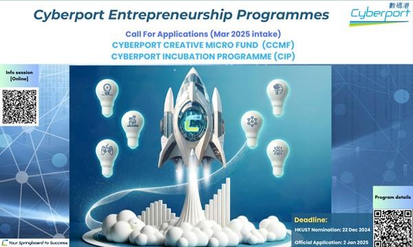 The application of Cyberport Creative Micro Fund (Hong Kong Programme) and Cyberport Incubation Programme (Mar 2025 intake) will start in Dec with deadline on 2 Jan 2025. The programmes are offering funding from HK$100,000 to HK$500,000 and comprehensive entrepreneurial supports from co-working spaces, hardware and software facilities, training & mentorship, product and business development to investment opportunities to help start-ups to pursue their entrepreneurial dreams. Apply now!