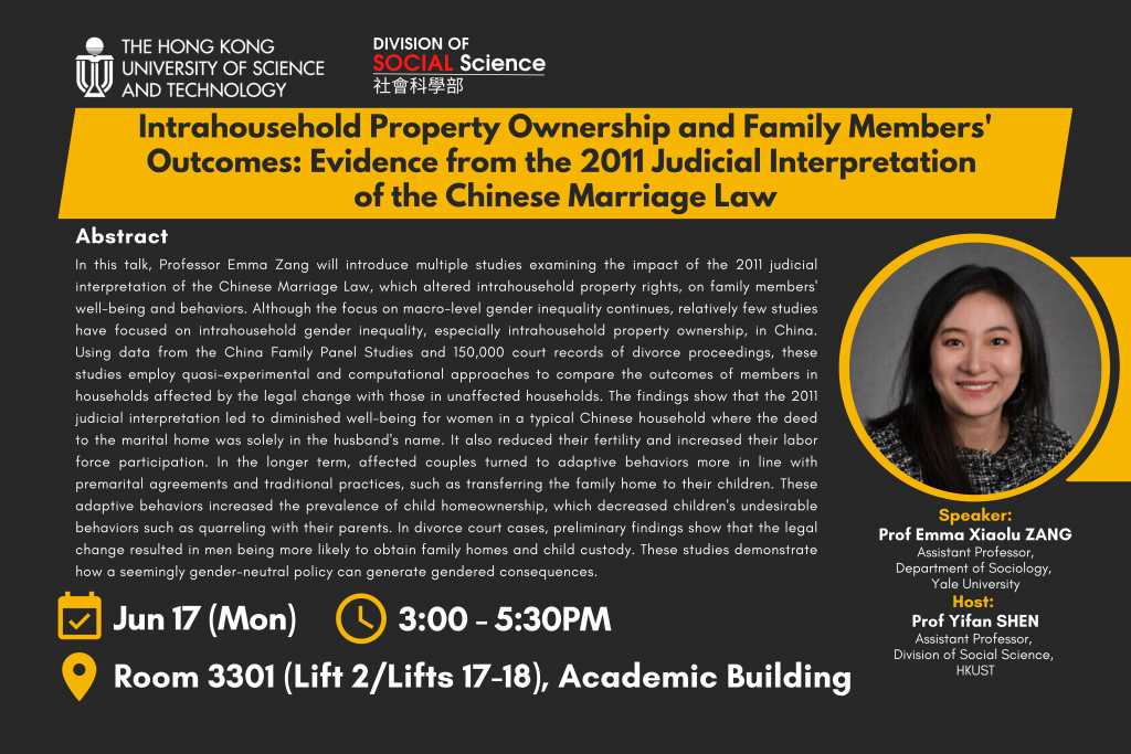 In this talk, Professor Emma Zang will introduce multiple studies examining the impact of the 2011 judicial interpretation of the Chinese Marriage Law, which altered intrahousehold property rights, on family members' well-being and behaviors. Although the focus on macro-level gender inequality continues, relatively few studies have focused on intrahousehold gender inequality, especially intrahousehold property ownership, in China. Using data from the China Family Panel Studies and 150,000 court records of divorce proceedings, these studies employ quasi-experimental and computational approaches to compare the outcomes of members in households affected by the legal change with those in unaffected households. The findings show that the 2011 judicial interpretation led to diminished well-being for women in a typical Chinese household where the deed to the marital home was solely in the husband's name. It also reduced their fertility and increased their labor force participation. In the longer term, affected couples turned to adaptive behaviors more in line with premarital agreements and traditional practices, such as transferring the family home to their children. These adaptive behaviors increased the prevalence of child homeownership, which decreased children's undesirable behaviors such as quarreling with their parents. In divorce court cases, preliminary findings show that the legal change resulted in men being more likely to obtain family homes and child custody. These studies demonstrate how a seemingly gender-neutral policy can generate gendered consequences.