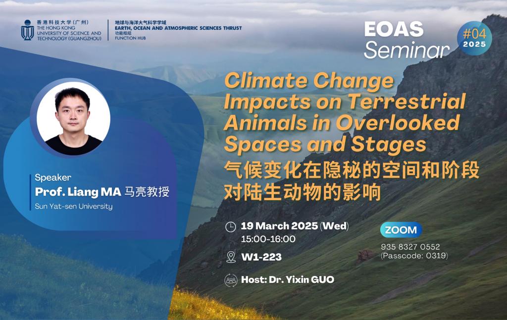 Public Research Seminar by Earth, Ocean and Atmospheric Sciences (EOAS) Thrust, HKUST (GZ) - Climate change impacts on terrestrial animals in overlooked spaces and stages 气候变化在隐秘的空间和阶段对陆生动物的影响