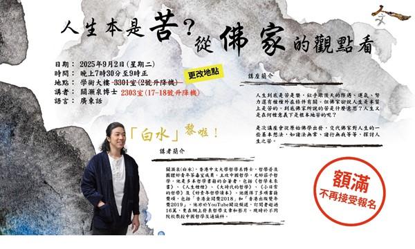 人生到底是苦是樂,似乎跟後天的際遇、運氣、努力還有種種外在條件有關。但佛家卻說人生是本質上是苦的。到底佛家所說的苦是什麼意思?人生又是在何種意義下是根本地苦的呢? 是次講座會從原始佛學出發,交代佛家對人生的一些基本想法,如諸法無常、諸行無我等等,探討人生之苦。