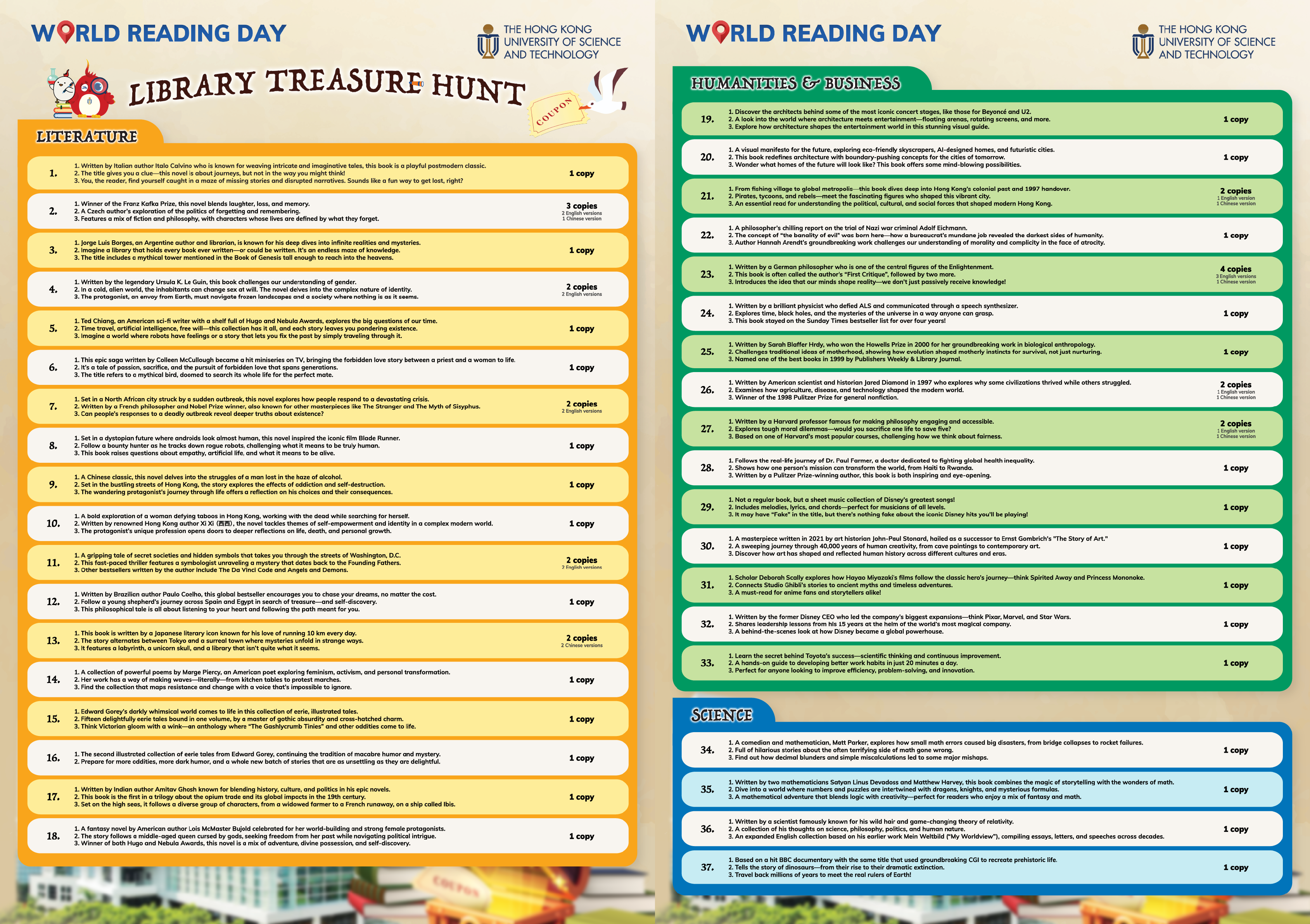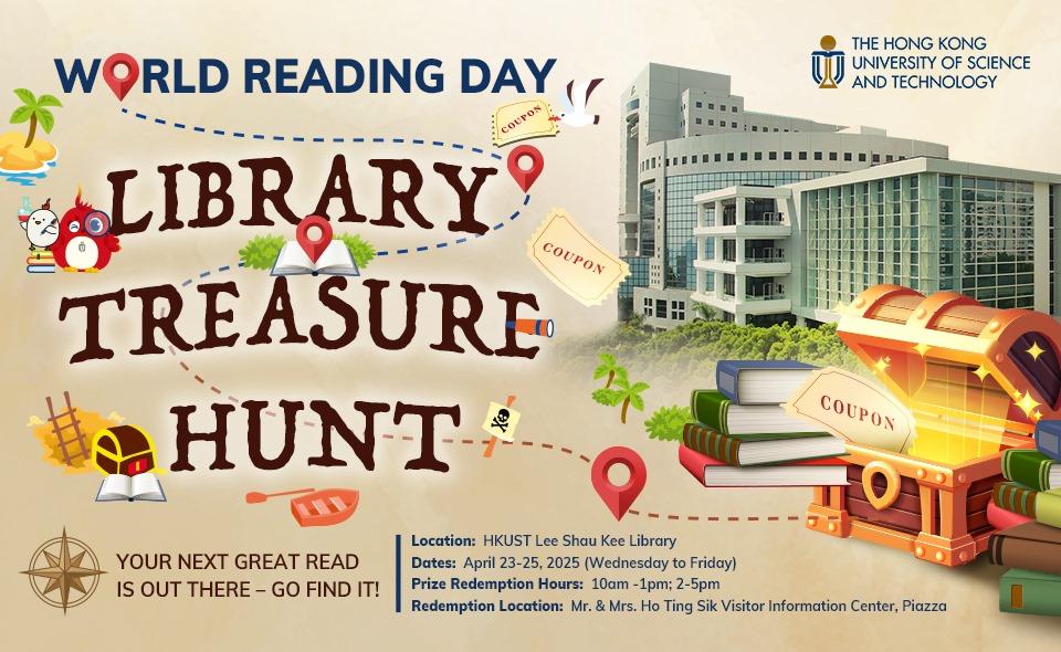 To celebrate the World Reading Day on 23 April, The Global Engagement & Communications Office (GECO) invite you to embark on an exciting 3-day Treasure Hunt at the Lee Shau Kee Library! Our library will transform into a treasure trove filled with over 30 hidden books and mystery vouchers.
