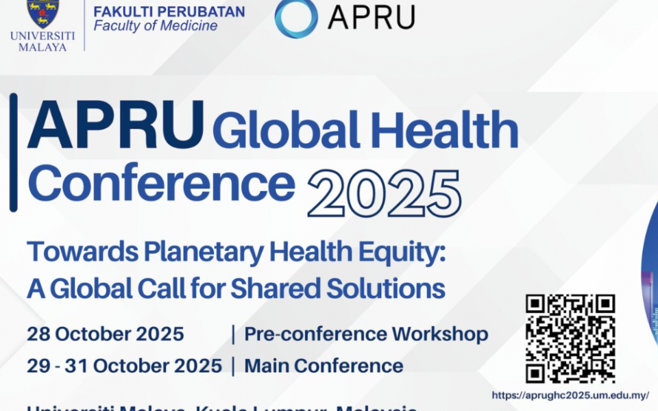 The APRU Global Health Conference 2025, co-hosted by the Department of Social and Preventive Medicine, Faculty of Medicine, Universiti Malaya, and the Association of Pacific Rim Universities (APRU), is scheduled to take place from 28 to 31 October 2025, at the Universiti Malaya, Kuala Lumpur, Malaysia.