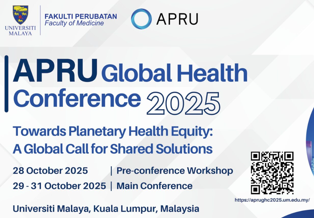 The APRU Global Health Conference 2025, co-hosted by the Department of Social and Preventive Medicine, Faculty of Medicine, Universiti Malaya, and the Association of Pacific Rim Universities (APRU), is scheduled to take place from 28 to 31 October 2025, at the Universiti Malaya, Kuala Lumpur, Malaysia.