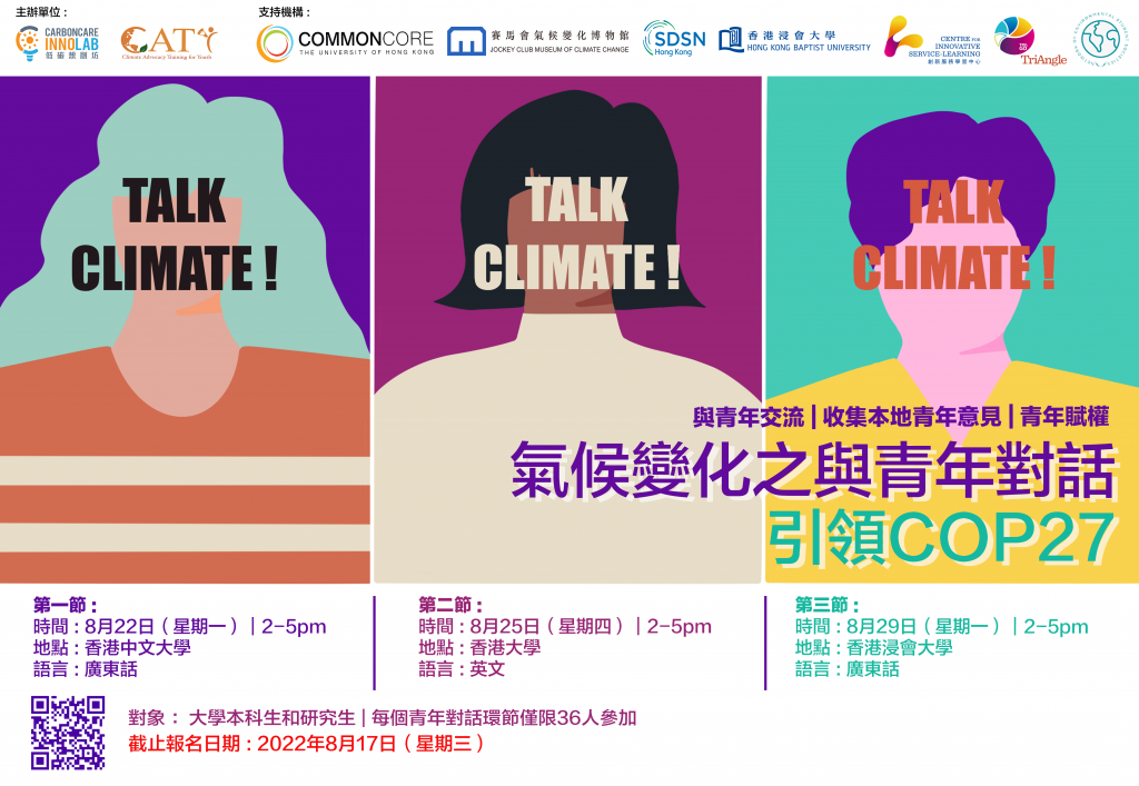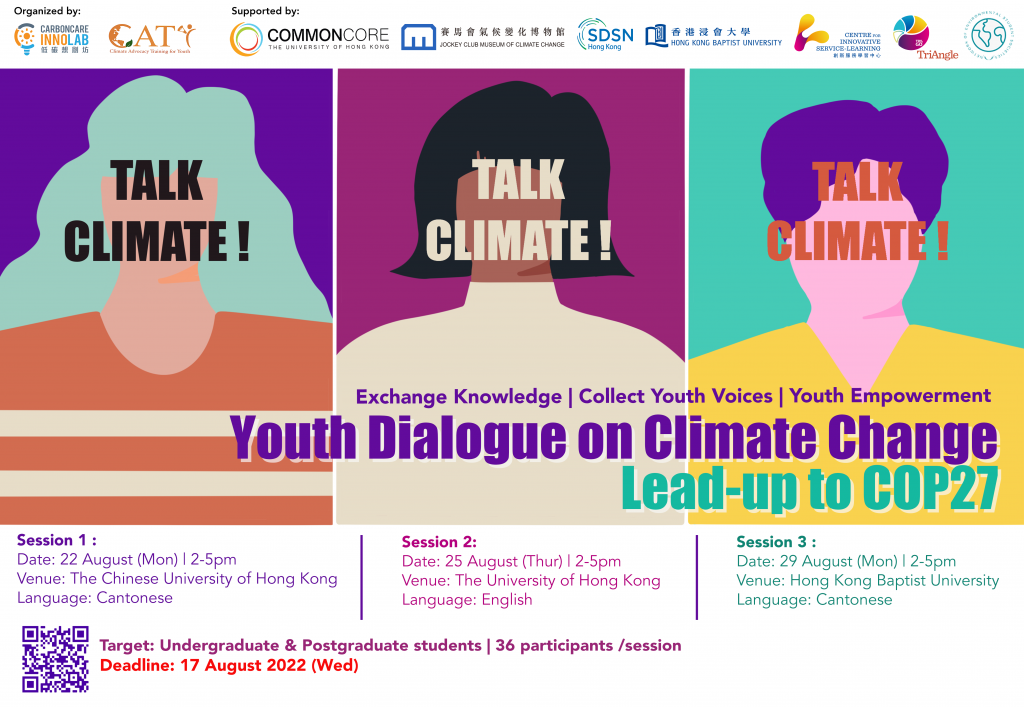 The Youth Dialogue aims at highlighting, inspiring, and recognizing the role of youth in climate action to raise awareness, create a call-for-action, and prepare young climate advocates across Hong Kong for larger, global dialogues in the lead-up to COP27. All undergraduate and postgraduate students are welcome to participate free of charge. A certificate of attendance will also be awarded to all participants.