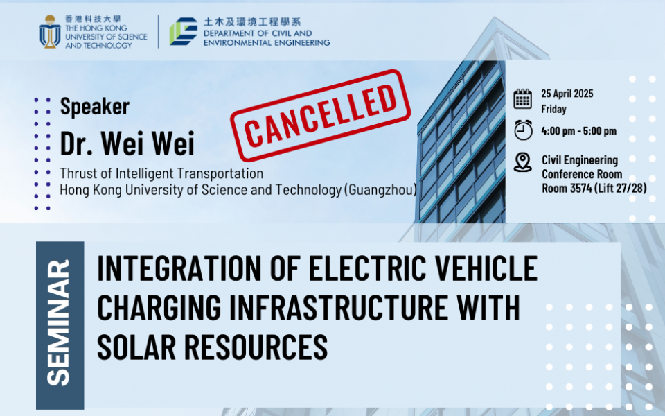[CANCELLED] Civil Engineering Departmental Seminar - Integration of electric vehicle charging infrastructure with solar resources