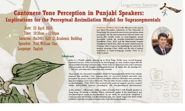 In this seminar, I will present a study in which we tested PAM-S with Punjabi speakers in Hong Kong. Of interest is whether PAM-S consistently applies to the phonological and non-phonological modes of discrimination. In our study, the participants completed a Cantonese tone assimilation and discrimination task. Our results suggest that PAM-S fully predicted Cantonese tone discrimination only in the phonological mode.