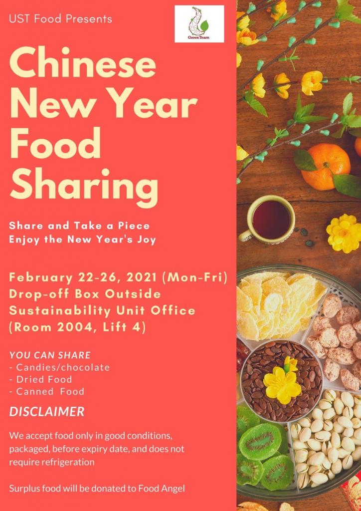 Our UST Food team & the Green Team are organizing an event to collect surplus Chinese New Year goodies such as chocolates, candies, Chinese New Year sweet puddings and redistribute them. Please come to drop off or collect some to avoid wasting these precious treats. Our display with the details of the event will be located in Academic Concourse outside LT-C from 22nd to 26th February, 2021 (Monday to Friday). The food collection box will be placed outside the Sustainability Unit office (Room 2004, Lift 4).