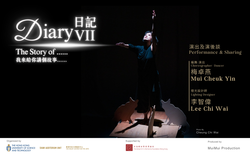 香港著名舞蹈家梅卓燕由1986年開始編作舞蹈劇場《日記》系列,曾記錄童年時在中國的生活,女性身體的變化,以及她的舞蹈生涯。《日記VII • 我來給你講個故事…… 》透過文字、光影、聲音,揉合如水的身段及身體的印記,書寫多年來與流浪貓同行的經歷。通過貓咪狡黠而機敏的眼晴,凝視世界變遷,倒影我城明暗。豎起尾巴,走過年月輪替;踮起腳尖,撫滑生命感知;垂首舔舐,逐漸消逝的舊城故事。《日記 VII》在 「香港舞蹈年獎 2022 」分別獲得傑出編舞以及傑出小型場地舞蹈製作。