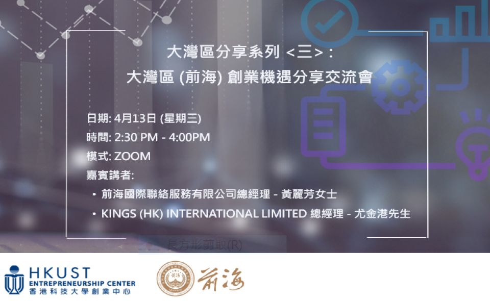 由香港科大創業中心、 前海國際聯絡服務有限公司合辦『大灣區 (前海) 創業機遇分享交流會』,是次分享及交流會將向有興趣在大灣區前海發展的創業團隊介紹大灣區發展前景、前海創業機遇及營商優勢。我們更邀請前海的創業家與大家分享在前海創業心得、優勢及挑戰。