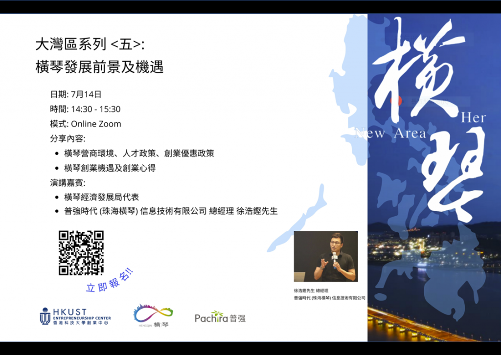 橫琴粵澳深度合作區為澳門產業多元化創造條件,並提供不少有利產業發展的措施。橫琴的四大產業包括,科技研發及高端製造、中醫藥、文旅會展商貿及現代金融。我們邀請橫琴經濟發展局代表及為我們分享橫琴營商環境、人才政策、創業優惠政策; 更邀請普強時代 (珠海橫琴) 信息技術有限公司 總經理 徐浩鏗先生為我們分享橫琴創業機遇及創業心得。