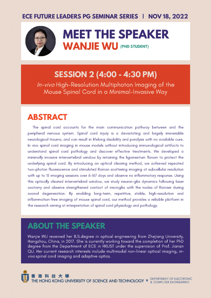 Wanjie WU received her B.S.degree in optical engineering from Zhejiang University, Hangzhou, China, in 2017. She is currently working toward the completion of her PhD degree from the Department of ECE in HKUST under the supervision of Prof. Jianan QU. Her current research interests include multimodal non-linear optical imaging, in-vivo spinal cord imaging and adaptive optics.
