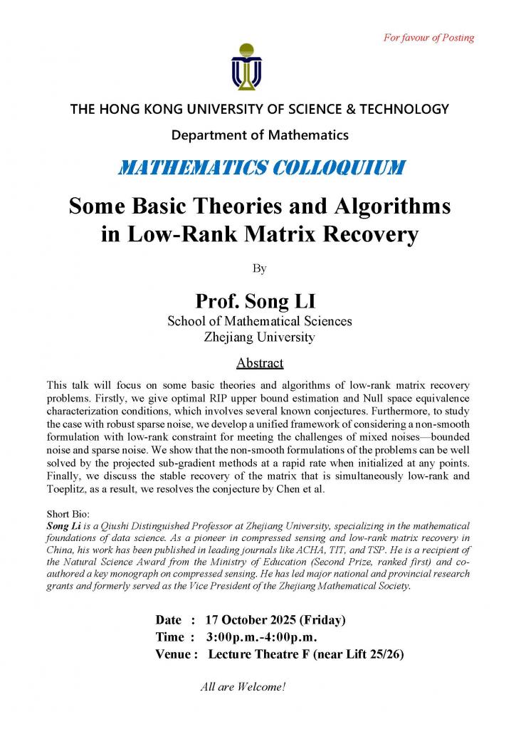 Department of Mathematics - Mathematics Colloquium - Some Basic Theories and Algorithms in Low-Rank Matrix Recovery