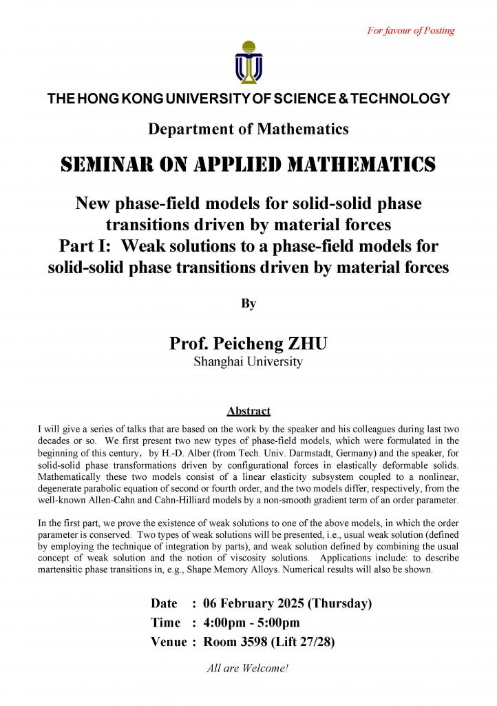 Department of Mathematics - SEMINAR ON APPLIED MATHEMATICS - New phase-field models for solid-solid phase transitions driven by material forces Part I: Weak solutions to a phase-field models for