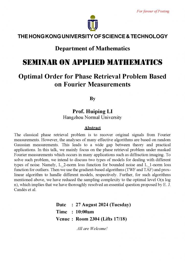 Department of Mathematics - Seminar on Applied Mathematics - Optimal Order for Phase Retrieval Problem Based on Fourier Measurements