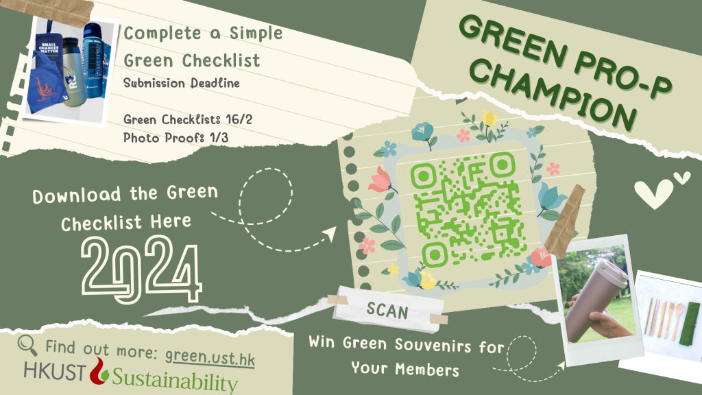 A Green Pro-P campaign is organised to encourage student societies to think and act sustainably to alleviate the waste issue during the promotional period. Municipal Solid Waste Charging Scheme will be implemented in April 2024 and all of us can contribute to reduce waste at source and recycle as much as possible.