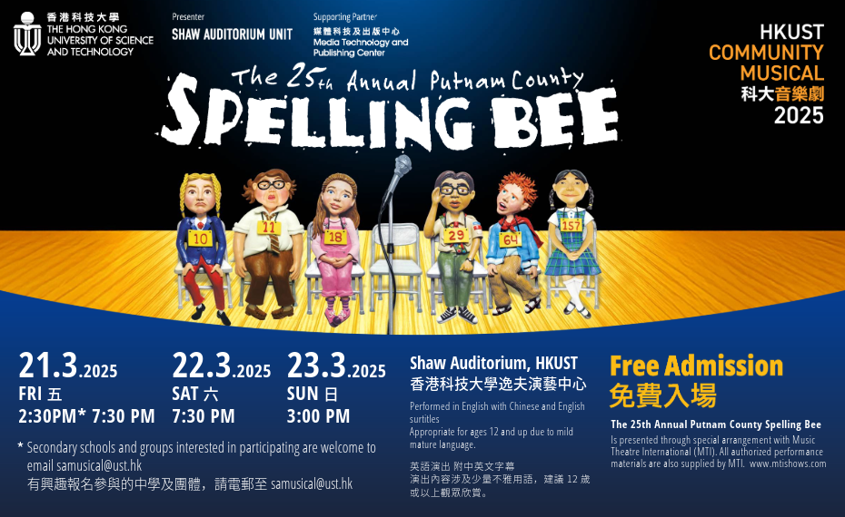 In 2024, the Shaw Auditorium Unit re-launched the University Musical series with a renewed focus on engaging the broader community, and announced its first-ever production of the HKUST Community Musical – The Music Man by Meredith Willson. This performance, staged at the Shaw Auditorium in March 2024, provided an even more captivating experience for the audience. In 2025, the Shaw Auditorium Unit is thrilled to present The 25th Annual Putnam County Spelling Bee, a witty, award-winning production that features an array of quirky characters, vibrant music, and innovative staging in March 2025. This show promises a delightful fusion of humor, heartwarming moments, and engaging melodies, offering a truly unforgettable theatrical experience suitable for the audience.