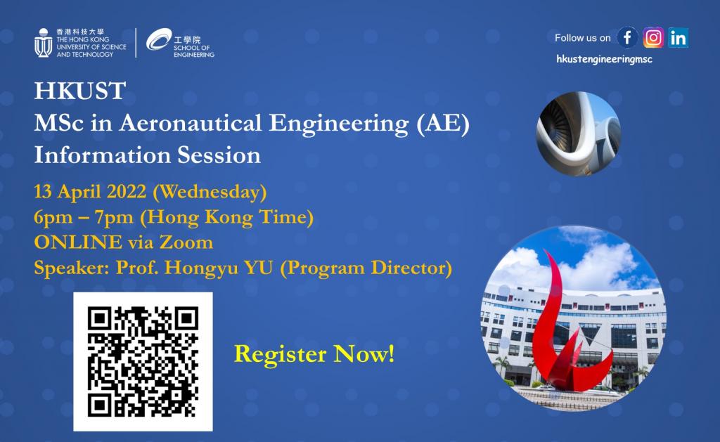 Come join this Information Session on 13 April 2022(Wednesday, 6:00pm, Hong Kong Time) to learn more about HKUST MSc in Aeronautical Engineering program!