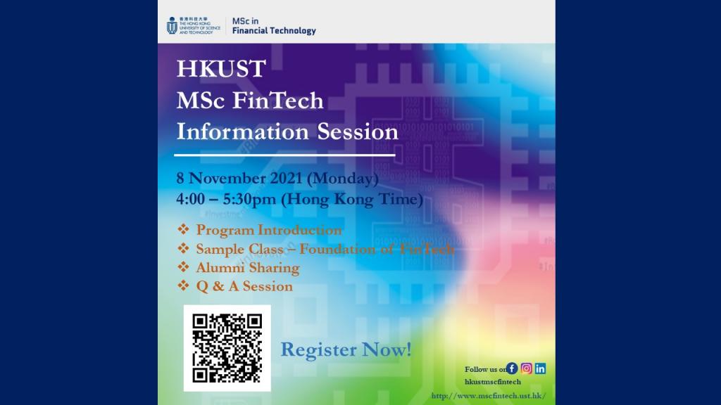 Come join this Information Session on 8 November 2021 (Monday, 4:00pm, Hong Kong Time) to learn more about our MSc FinTech program!