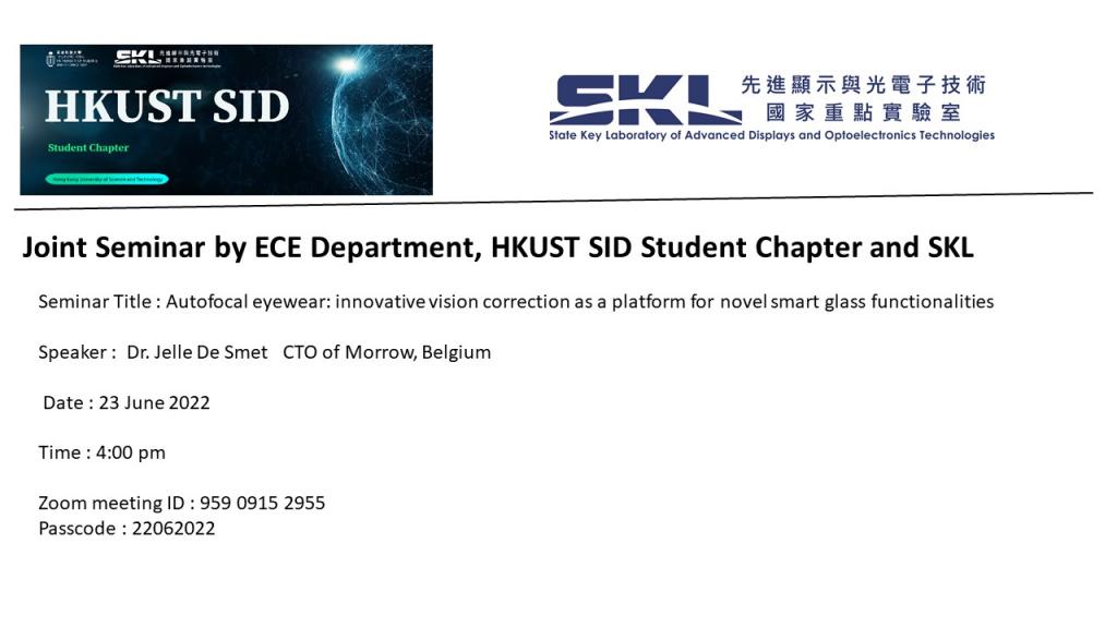 Joint Seminar by ECE Department, HKUST SID Student Chapter and SKL - Autofocal eyewear: innovative vision correction as a platform for novel smart glass functionalities