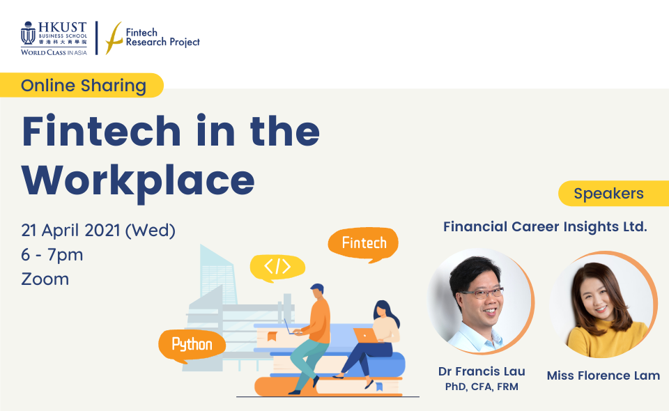 Subsequent to the introductory workshop about the overall fintech industry landscape last November, Dr. Francis Lau (PhD, CFA, FRM) and Miss Florence Lam from Financial Career Insights Limited will share with us more real-life scenarios of the fintech workplace, as well as valuable insider advice on how to get yourself technically prepared for the exciting fintech world!