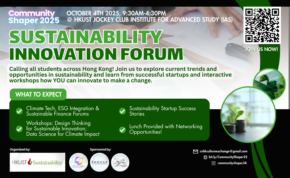 The Sustainability Innovation Forum is jointly organized by China Hong Kong Culture Exchange Association and HKUST Sustainability/Net-Zero Office, as part of the wider Community Shaper 2025 programme. The Community Shaper initiative is funded by the Innovation and Technology Fund General Support Programme from the Innovation and Technology Commission and aims to cultivate talent and integrate innovation and technology resources across cities in the Greater Bay Area. The Sustainability Innovation Forum is part of a four-part series, with Edutech, Healthtech and Fintech forums being organised during October - December 2025. More information about the overall Community Shaper program can be found here: Community Shaper 2025 | China Hong Kong Culture Exchange Association. Questions can be directed to the CNHK team at cnhkcultureexchange@gmail.com