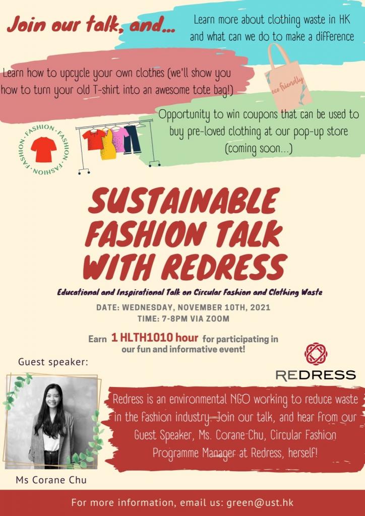 Have you ever thought that we may all own more clothes than we really need? Although the 11/11 sales will surely be tempting, we hope you can join us on 10/11 to understand the negative impacts the fashion industry is having on our planet. We, a group of passionate HKUST students, are collaborating with Redress, a local environmental NGO, to bring awareness about circular fashion and spark changes!