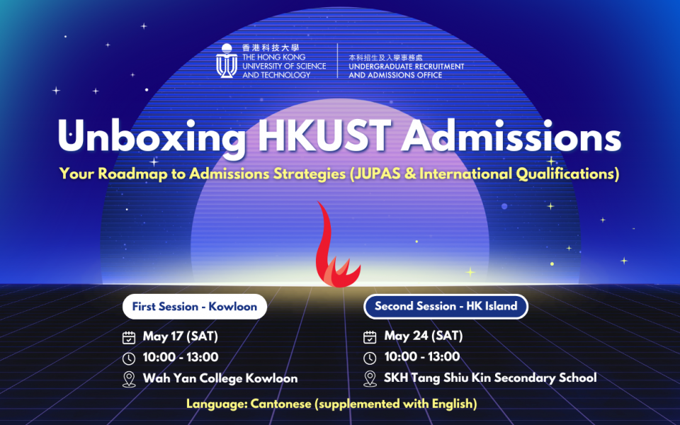Following the success of the "Unboxing HKUST Admissions" event in past years, we are excited to announce that we will visit two districts in May 2025: Kowloon and Hong Kong Island on May 17 and May 24, respectively.