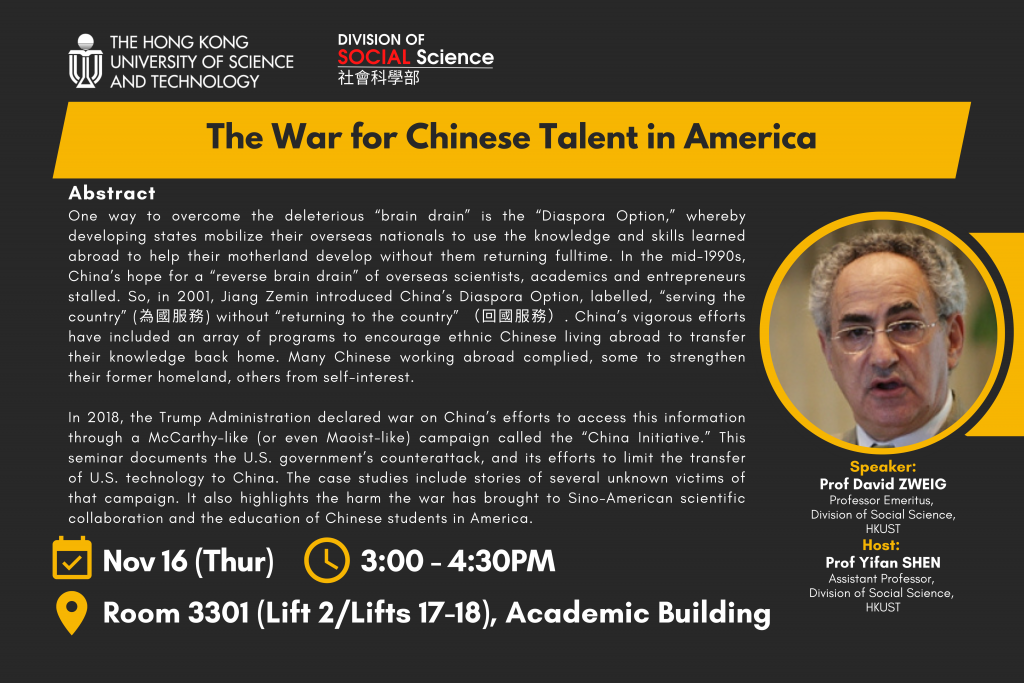 Zweig studied in Beijing in 1974-1976 and did field research in rural China in 1980-1981 and 1986, and in 1991-1992 he explored the internationalization of southern Jiangsu Province. Since 1991, he has surveyed and interviewed 100s of returned academics, scientists, entrepreneurs, and employees who returned to various cities in China, as well as those who have remained abroad. He has conducted about a dozen surveys on this topic. In 2012, he briefed the designer of the 1000 Talents Plan, Li Yuanchao, about why his program was struggling. He has been an expert witness for the defence in two cases under the U.S. Department of Justice’s “China Initiative,” which investigated many PRC-born Chinese working in America.
