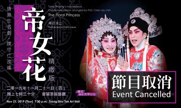 We are sorry that the event ‘Cantonese Opera - The Floral Princess ’ is CANCELLED owing to the continuing escalating tension and unrest in different parts of Hong Kong and the transport disruption. We apologize for the inconvenience caused.