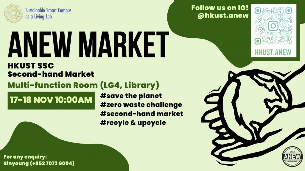 ANEW aims to promote sustainability and the Zero Waste Challenge on HKUST campus through reusing and upcycling second-hand items. The primary goal is to allow students and staff to easily join for enhancing sustainable life on campus while enjoying satisfactory quality of second-hand items.