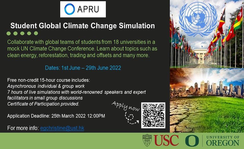 Experience what it’s like to be a delegate at the UN Climate Change Negotiations, join us in this opportunity to collaborate with a global team of students from 12 Association for Pacific Rim Universities (APRU) to learn and explore the potential climate futures.
