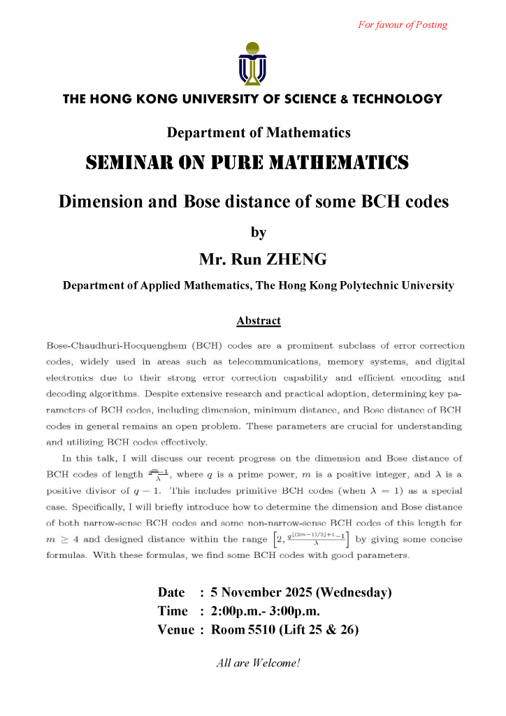 Department of Mathematics - Seminar on Pure Mathematics - Dimension and Bose distance of some BCH codes