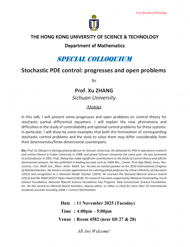 Department of Mathematics - Special Colloquium - Stochastic PDE control: progresses and open problems