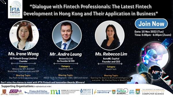 We are excited to have awardees from IFTA Fintech and Innovation Awards 2021/2022 to share with us their achievements in Fintech & their outstanding Fintech products or services. IFTA Fintech and Innovation Awards has been exhibiting extraordinary achievements made by companies and individuals in the Finance and Technology industries since 2018. This year in HKUST, awardees from “Blockchain, Cryptocurrency and CEP”, “Regulatory Tech” and “Wealth Tech” are invited to share their experience and the latest development in the Fintech industry.
