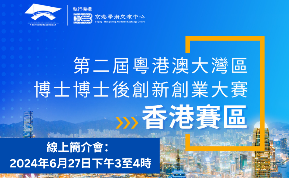 「第二屆粵港澳大灣區博士博士後創新創業大賽」香港分賽區的報名工作已經展開,京港學術交流中心為香港地區賽事的執行單位。為讓各單位清晰瞭解本屆賽事的申報資格和其他相關詳情,京港學術交流中心將聯同大賽主辦機構於6月27日(週四)下午3時至4時舉行線上簡介會。
