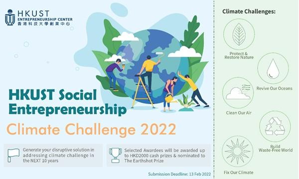 While the world is emphasizing on the need for global health amid COVID19 pandemic, a healthy plant is also crucial in improving human health. Imminent actions upon tackling climate change and enhancing environmental protection always involve collaboration across global communities. It is time for you to unleash your potential and generate disruptive ideas.  Join the HKUST Social Entrepreneurship - Climate Challenge 2022, organized by HKUST Entrepreneurship Center. Submit a sustainable solution to be achieved by 2023 on addressing the environmental challenge in 5 categories: 1) Nature, 2) Air, 3) Oceans, 4) Waste Free World and 5) Climate. The solution can be identified across all sectors, from grassroots to businesses with feasible innovations.  The winners will be awarded up to HKD 2000 cash prize. Moreover, they may be nominated to The Earthshot Prize 2022 to win £1 Million in prize money, as well as the tailored support and opportunities to scale up. All participants will receive a certificate of participation.