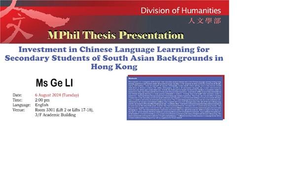 HUMA MPhil Thesis Presentation - Investment in Chinese Language Learning for Secondary Students of South Asian Backgrounds in Hong Kong