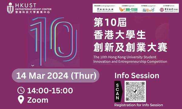 Information Session of The 10th Hong Kong University Student Innovation and Entrepreneurship Competition will be held on 14 Mar 2024. In this session, you will be able to get more understanding of the competition requirement, successful cases and application tips. Come to join the Info Session to get more understanding of the Competition and exchange your ideas with us.