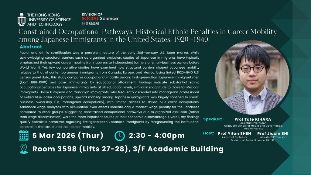 Social Science Seminar - Constrained Occupational Pathways: Historical Ethnic Penalties in Career Mobility among Japanese Immigrants in the United States, 1920–1940