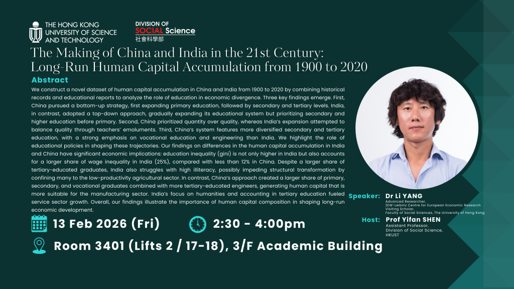 Social Science Seminar - The Making of China and India in the 21st Century: Long-Run Human Capital Accumulation from 1900 to 2020