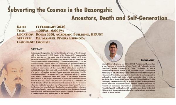 Dr. Rivera Espinoza is a young voice in the study of the Zhuangzi. His work challenges neo-orientalist tendencies in Western scholarship on Chinese philosophy and attempts to decolonize current perspectives on early Chinese classics by focusing on Latin-American voices. In addition to sharing some of his knowledge on proto-Daoism with the students, his presentation would also diversify our portfolio of scholars who present at HKUST since most come from either Mainland China and/or Chinese diaspora, as well as the US or Europe.