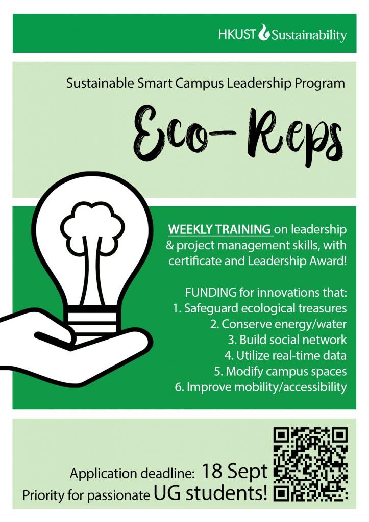 Are you passionate and do you have great ideas about building a sustainable campus? The HKUST Sustainability Unit is now recruiting for Sustainable Smart Campus Leadership Program. All full-time HKUST students are encouraged to apply as Eco-Reps. Students are welcome to join the information session on 10 September 2019 at 13:00 in Room 4334 (Lift 3)