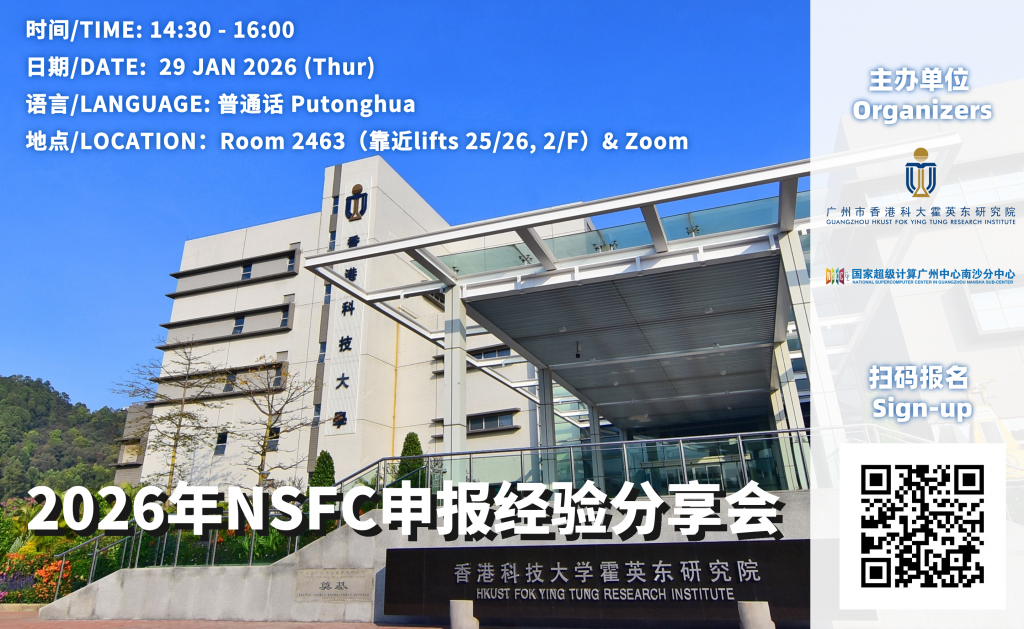 - The 2026 NSFC will soon be officially open for application. To better facilitate your proposal preparation and submission,Guangzhou HKUST Fok Ying Tung Research institute (FYTRl) will organize a sharing workshop on 29 Jan 2026(Thursday). Everyone who is interested in NSFC 2026 Program is cordially invited to attend the workshop.
