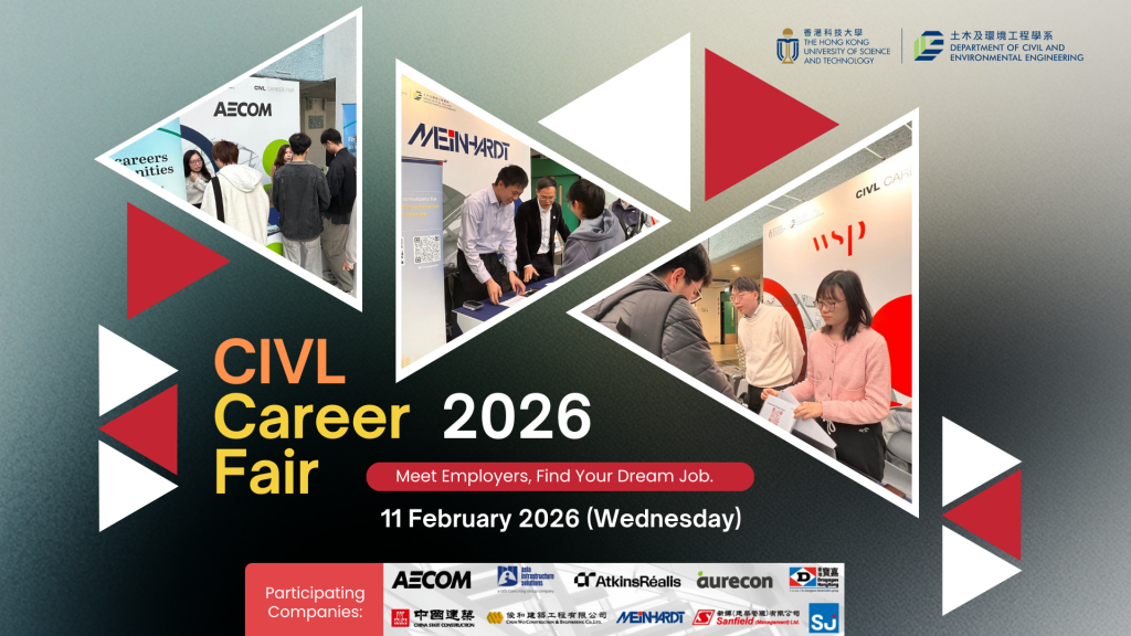 Ten civil engineering companies (AECOM, Asia Infrastructure Solutions Ltd., AtkinsRéalis, Aurecon, China State Construction Engineering (HK) Ltd., Chun Wo, Dragages (HK), Meinhardt, Sanfield (Management) Ltd. and SJ Group) will join this CIVL Career Fair. The career fair will feature a booth exhibition and recruitment talks tailored specifically for all CIVL undergraduate students, especially Year 3 students seeking internship opportunities, and Year 4 students seeking graduate jobs.