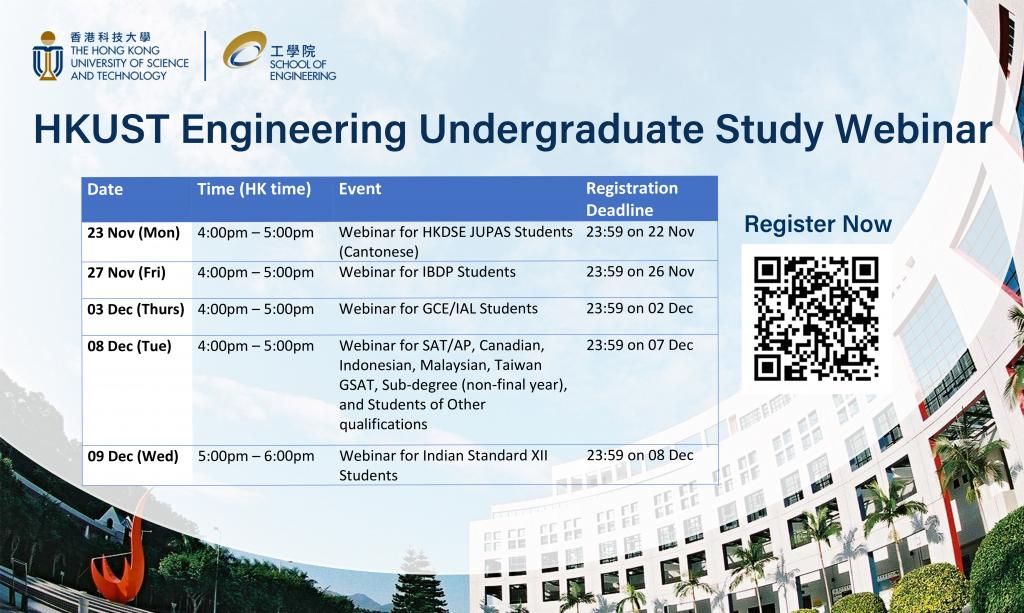 You are invited to our Engineering Undergraduate Study Webinar. This event will highlight our new program – Engineering with Extended Major in AI. It will also be a wonderful opportunity for us to hear from you during our Q&A session. Specific sessions are arranged to cater to the needs of students in various curricula.