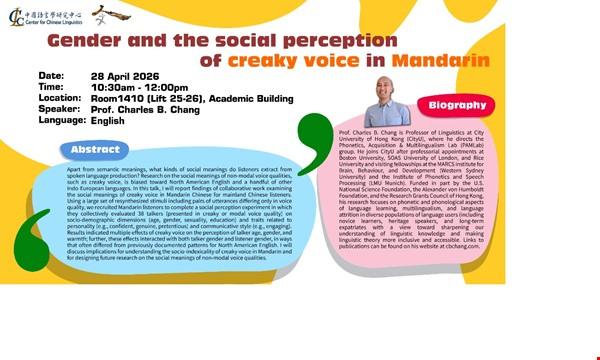 Apart from semantic meanings, what kinds of social meanings do listeners extract from spoken language production? Research on the social meanings of non-modal voice qualities, such as creaky voice, is biased toward North American English and a handful of other Indo-European languages. In this talk, I will report findings of collaborative work examining the social meanings of creaky voice in Mandarin Chinese for mainland Chinese listeners. Using a large set of resynthesized stimuli including pairs of utterances differing only in voice quality, we recruited Mandarin listeners to complete a social perception experiment in which they collectively evaluated 38 talkers (presented in creaky or modal voice quality) on socio-demographic dimensions (age, gender, sexuality, education) and traits related to personality (e.g., confident, genuine, pretentious) and communicative style (e.g., engaging). Results indicated multiple effects of creaky voice on the perception of talker age, gender, and warmth; further, these effects interacted with both talker gender and listener gender, in ways that often differed from previously documented patterns for North American English. I will discuss implications for understanding the socio-indexicality of creaky voice in Mandarin and for designing future research on the social meanings of non-modal voice qualities.