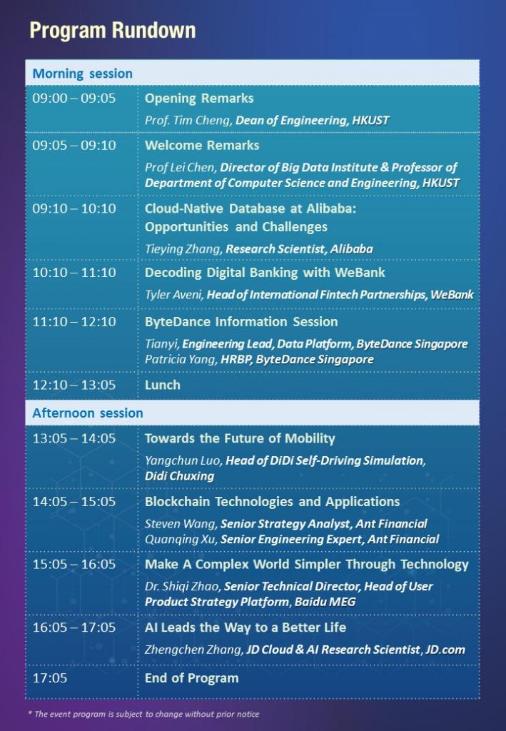 Speakers from various technology enterprises such as Alibaba, Ant Financial, Baidu, ByteDance, Didi Chuxing, JD.com, WeBank, etc.