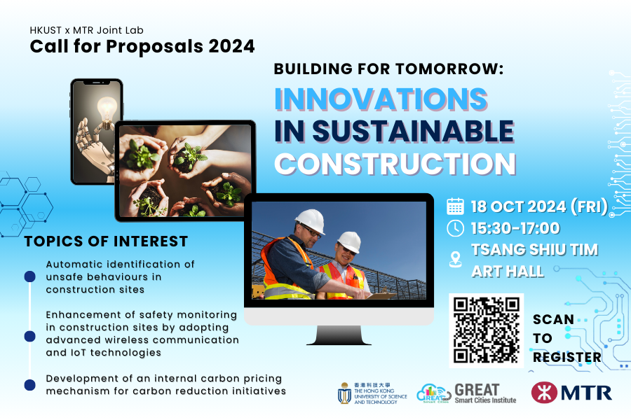 The Hong Kong University of Science and Technology (HKUST) set up a joint research laboratory with the Mass Transit Railway (MTR), i.e., the HKUST-MTR Joint Lab, on low-carbon smart city development. We are inviting research proposals on three main topics for the coming year, as detailed below: (a) Automatic identification of unsafe behaviours in construction sites, (b) Enhancement of safety monitoring in construction sites by adopting advanced wireless communication and IoT technologies, and (c) Development of an internal carbon pricing mechanism for carbon reduction initiatives. The selected project teams will work closely with MTR on real case studies with data and technical advice/support to be provided by MTR.